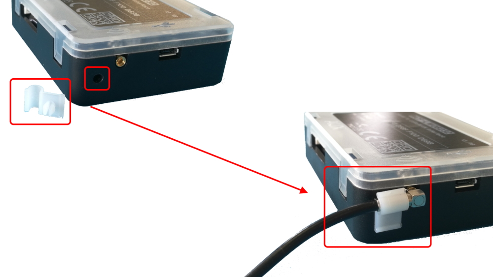 The magnetic antenna must be positioned on a metal body. It should preferably be vertical and at least 30 cm away from other metal bodies. The installation must take place in a place where the LoRaWAN® signal coverage is good (SF=7 optimal, SF=12 weak). Use the provided clip to hold the antenna connector in place, as in the picture:
