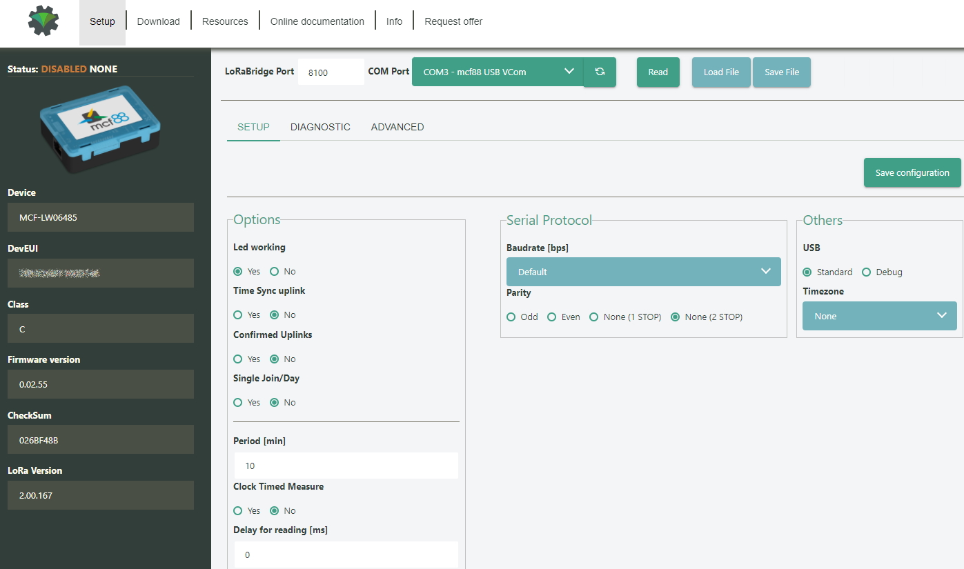 To deploy the sensor, use LoRaWEB online tool, to setup LoRaWAN® credentials and other preferences (only available for Windows®) :