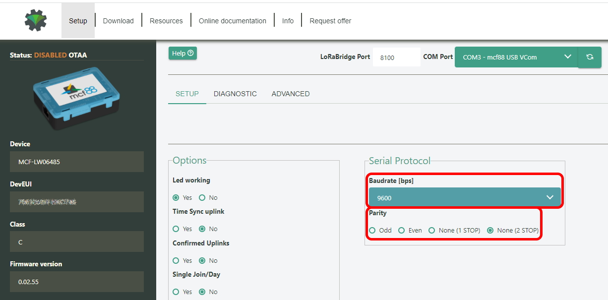 serial line parity/stop, only needed if different from the settings in LoRaWEB.